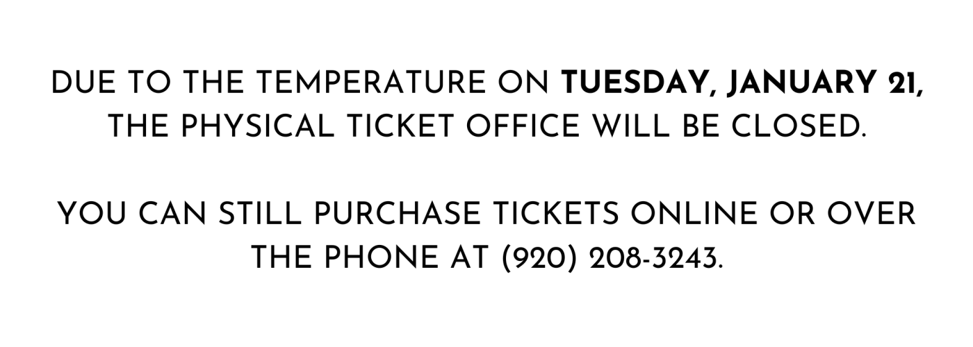 DUE TO THE TEMPERATURE ON TUESDAY JANUARY 21 THE PHYSICAL TICKET OFFICE WILL BE CLOSED. YOU CAN STILL PURCHASE TICKETS ONLINE OR OVER THE PHONE AT 920 208 3243